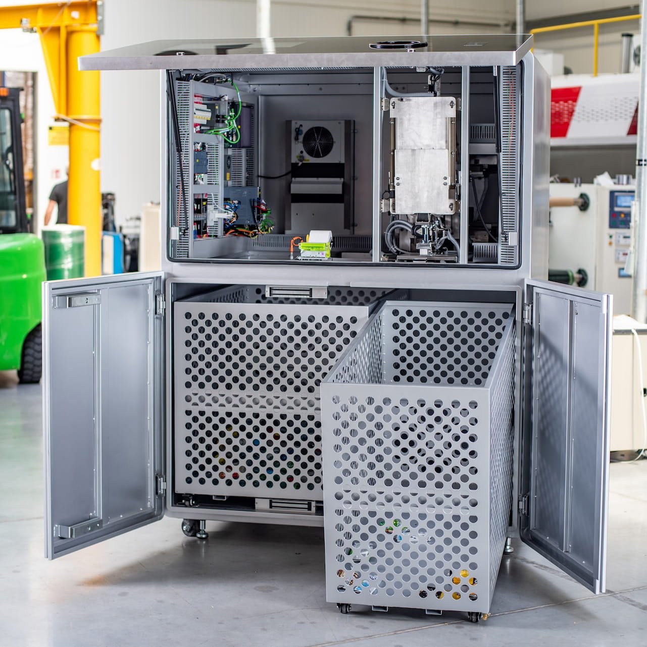 Sercem naszych urządzeń jest moduł sztucznej inteligencji oparty na technologiach rozpoznawania obrazów, uczenia maszynowego (ML) oraz klasyfikacji materiałów. Automat potrafi w czasie rzeczywistym rozpoznać materiał, kształt, kod kreskowy oraz stan opakowan